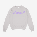 Cute meets cozy with this Canes Bows Youth Crewneck — a perfect mix of hometown pride and sideline style. The soft ash gray fleece keeps things comfy and warm, while the lilac “Canes” script with bow accents adds the sweetest touch of charm. Ideal for cool game days, school spirit wear, or lounging at home.